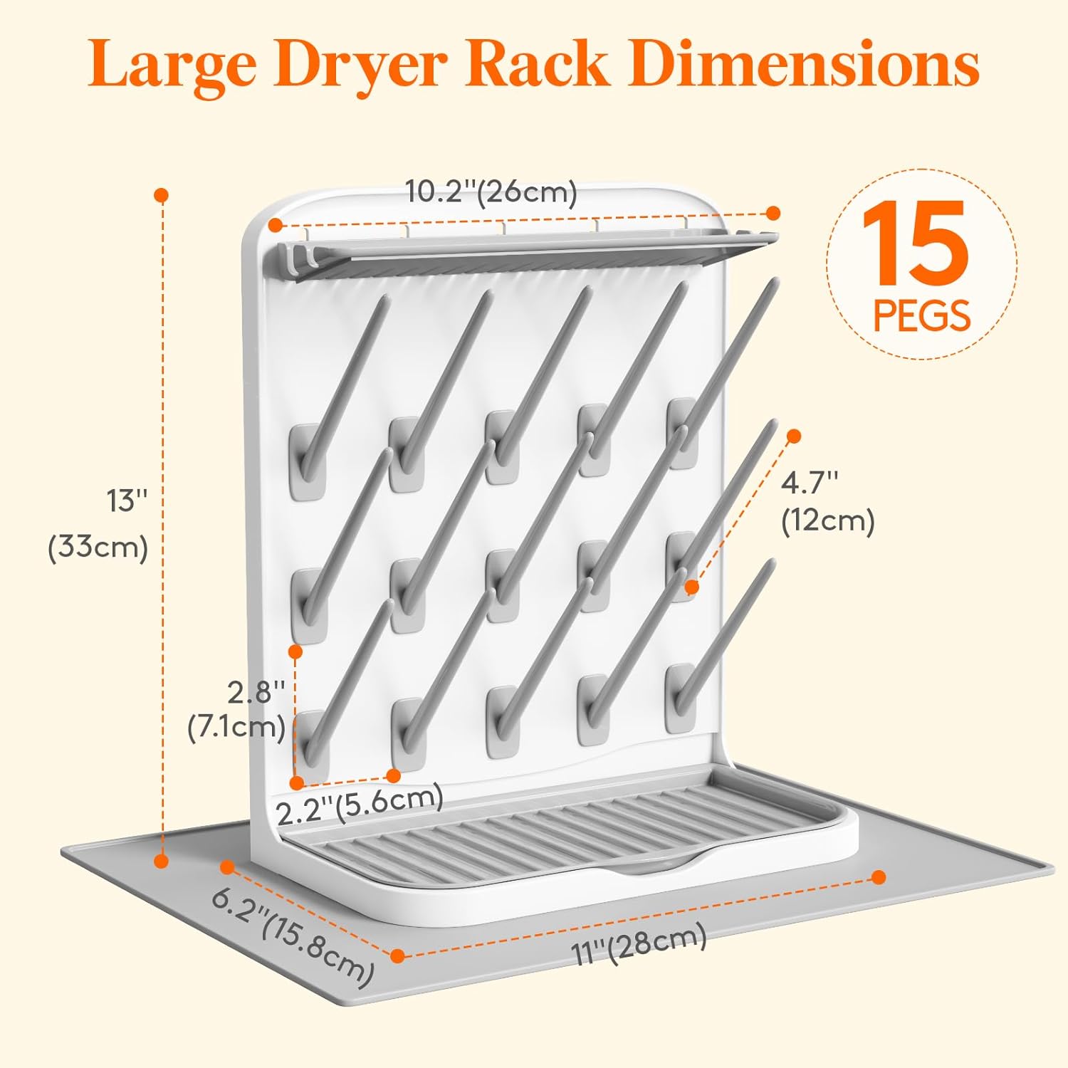 All-in-One Baby Bottle Drying Rack: This drying rack features 15 pegs that accommodate 4-5 sets of bottles of all sizes and accessories, including nipples, straws, pacifiers, valves, lids and breast pump parts, offering a space-saving storage solution